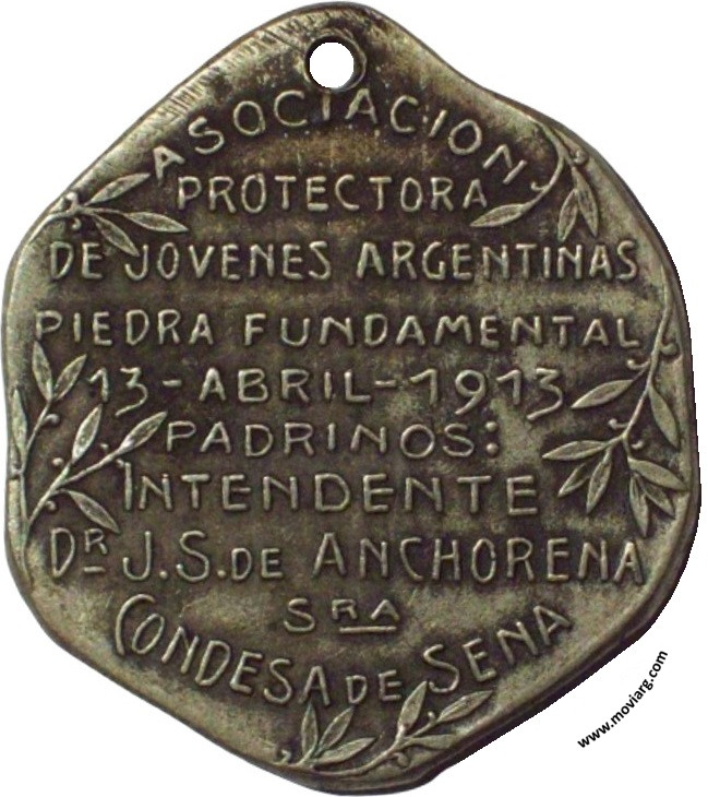 Anverso: LABOR FIDES. Firma: J. GOTTUZZO Reverso: ASOCIACION / PROTECTORA / DE JOVENES ARGENTINAS / PIEDRA FUNDAMENTAL / 13 - ABRIL - 1913 / PADRINOS : / INTENDENTE / DR. J. S. DE ANCHORENA / SRA. / CONDESA DE SENA Referencia: | |
