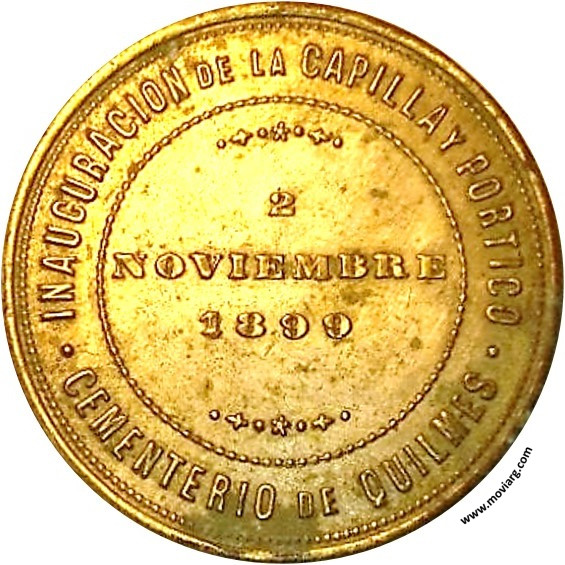 Anverso: INAUGURACION DE LA CAPILLA Y PORTICO / CEMENTERIO DE QUILMES / 2 / NOVIEMBRE / 1899 Reverso: PADRINOS / OLEGARIO / PONCE DE LEON / JOSEFA LABOURT / DE / PONCE DE LEON / INTENDENTE / JOAQUIN R. AMOEDO Referencia: | |