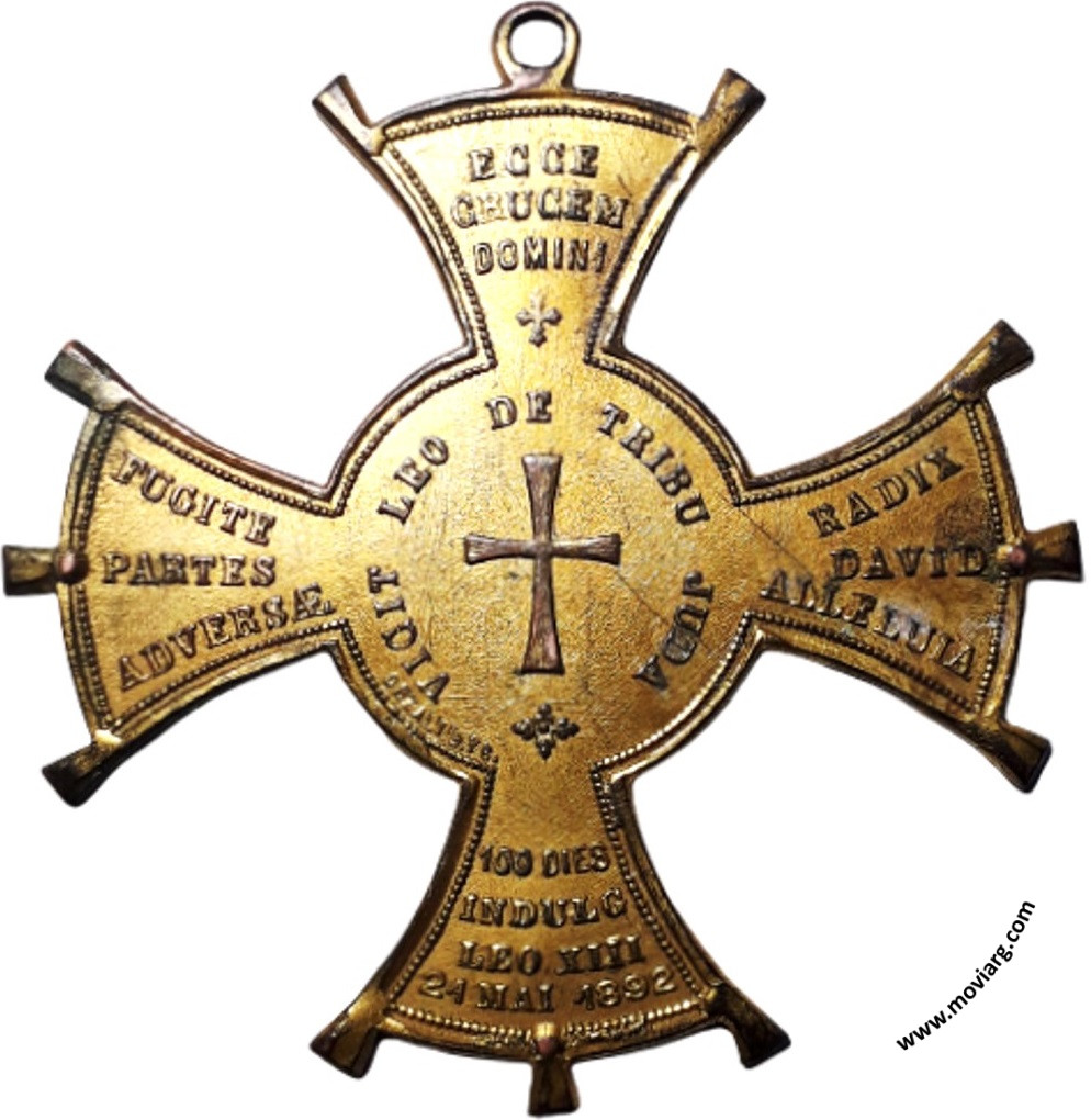 Anverso: S. ANTONI / ORA PRO NOBIS / PIA UNIO / S. ANTONII / PATAVINI / ROMAE / VIA / MERULANA / 124. Campo: IHS Reverso: VICIT LEO DE TRIBU JUDA / FUGITE / PARTES / ADVERSÆ / ECCE / CRUCEM / DOMINI / RADIX / DAVID / ALLELUIA / 100 DIES / INDULG / LEO XIII / 21 MAI 1892. Firma: ORZALI B. Y C. Referencia: | |