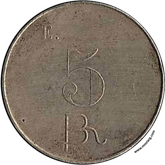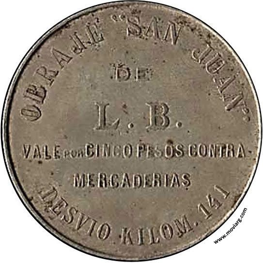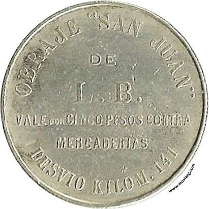 Anverso: E. [ ] / 5 / B Reverso: OBRAJE "SAN JUAN" / DE / L. B. / VALE POR CINCO PESOS CONTRA / MERCADERIAS / DESVIO KILOM. 141 Canto: Estriado Recto Referencia: | |