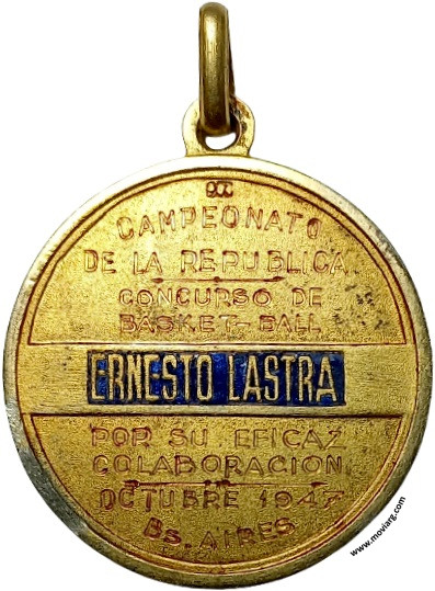 Anverso: CONFEDERACION ARGENTINA / DE BASKET BALL Reverso: [ CAMPEONATO ] / [ DE LA REPUBLICA ] / [ CONCURSO DE ] / [ BASKET-BALL ] / [ ERNESTO LASTRA ] / [ POR SU EFICAZ ] / [ COLABORACION ] / [ OCTUBRE 1947 ] / [ BS. AIRES ]. Exergo: [ 900 ] Referencia: | |