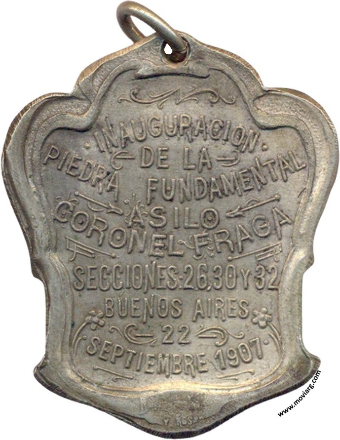Anverso: Reverso: INAUGURACION / DE LA / PIEDRA FUNDAMENTAL / ASILO / CORONEL FRAGA / SECCIONES 26, 30 Y 32 / BUENOS AIRES / 22 / SEPTIEMBRE 1907. Firma: BELLAGAMBA / Y ROSSI Referencia: | |