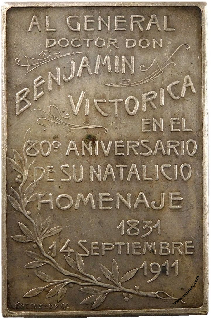 Anverso: Campo: LEY Reverso: AL GENERAL / DOCTOR DON / BENJAMIN / VICTORICA / EN EL / 80° ANIVERSARIO / DE SU NATALICIO / HOMENAJE / 1831 / 14 SEPTIEMBRE / 1911. Firma: GOTTUZZO Y CA. Canto: Liso Referencia: | |