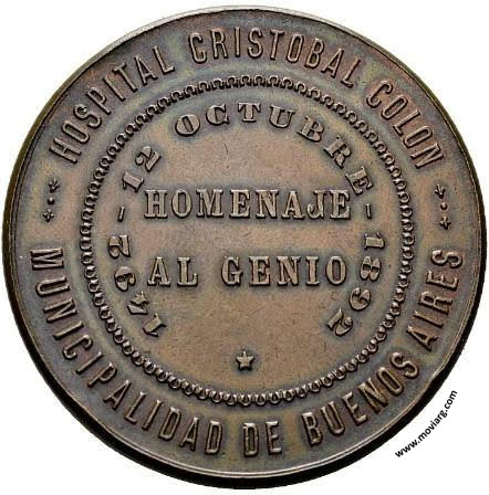 Anverso: IV CENTENARIO DEL DESCUBRIMIENTO DE AMERICA Reverso: HOSPITAL CRISTOBAL COLON / MUNICIPALIDAD DE BUENOS AIRES / 1492 - 12 OCTUBRE - 1892 / HOMENAJE / AL GENIO Referencia: | |