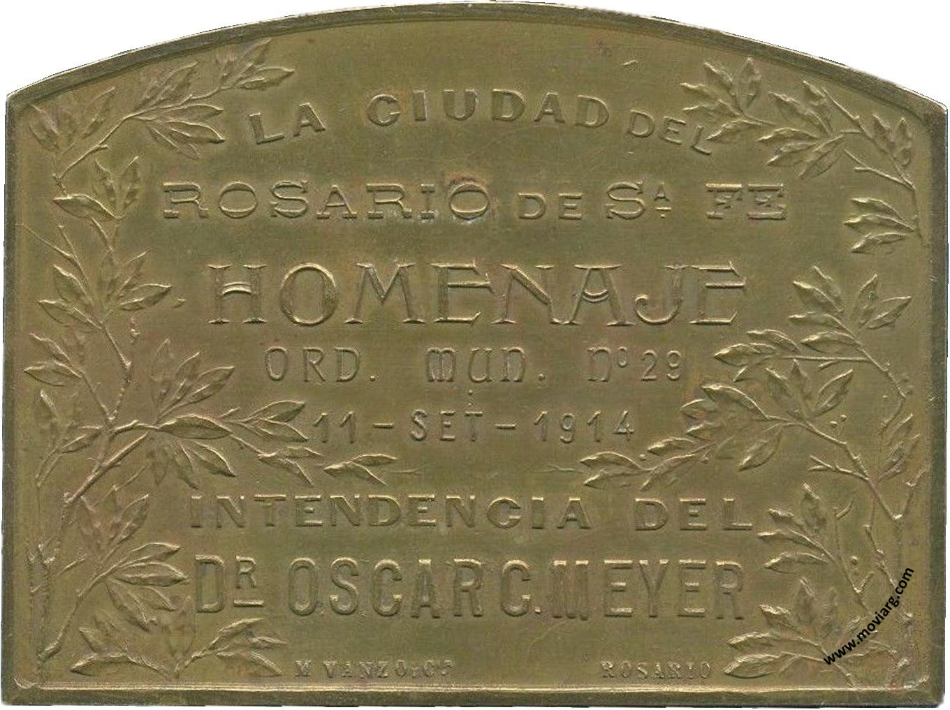 Anverso: PLAZA / SARMIENTO. Firma: A. PERERREST (???) Reverso: LA CIUDAD DEL / ROSARIO DE SA. FE / HOMENAJE / ORD. MUN. N° 29 / 11 - SET - 1914 / INTENDENCIA DEL / DR. OSCAR C. MEYER. Firma: M. VANZO Y CA. / ROSARIO Referencia: | |
