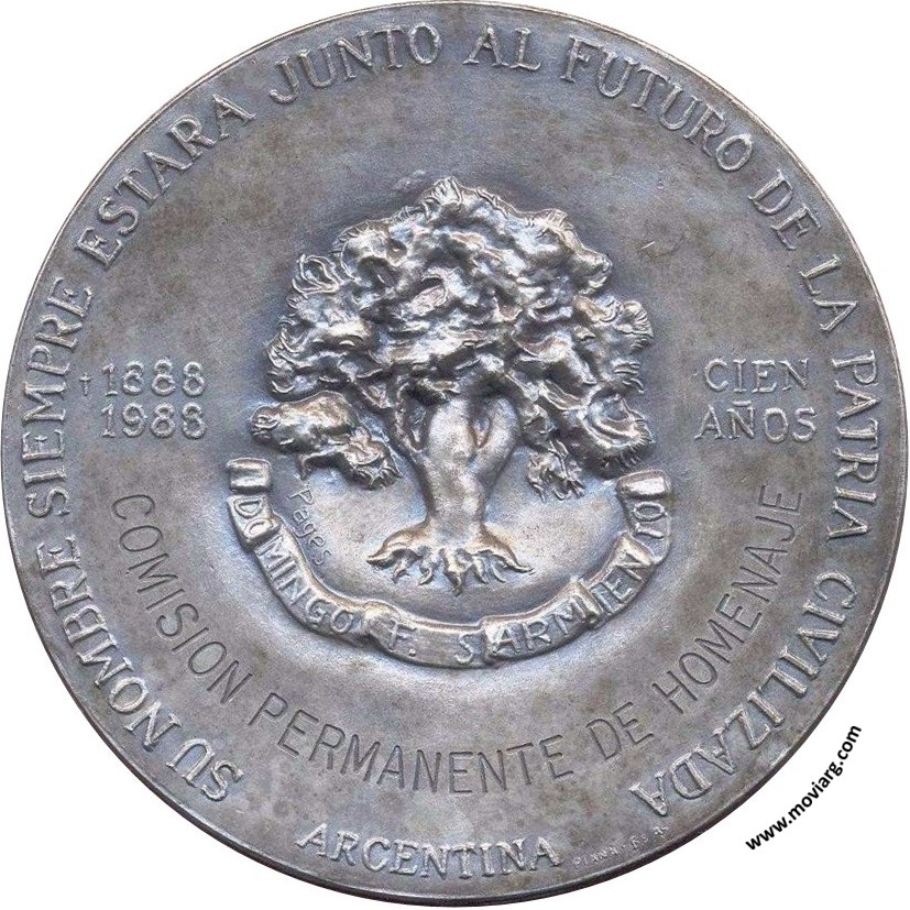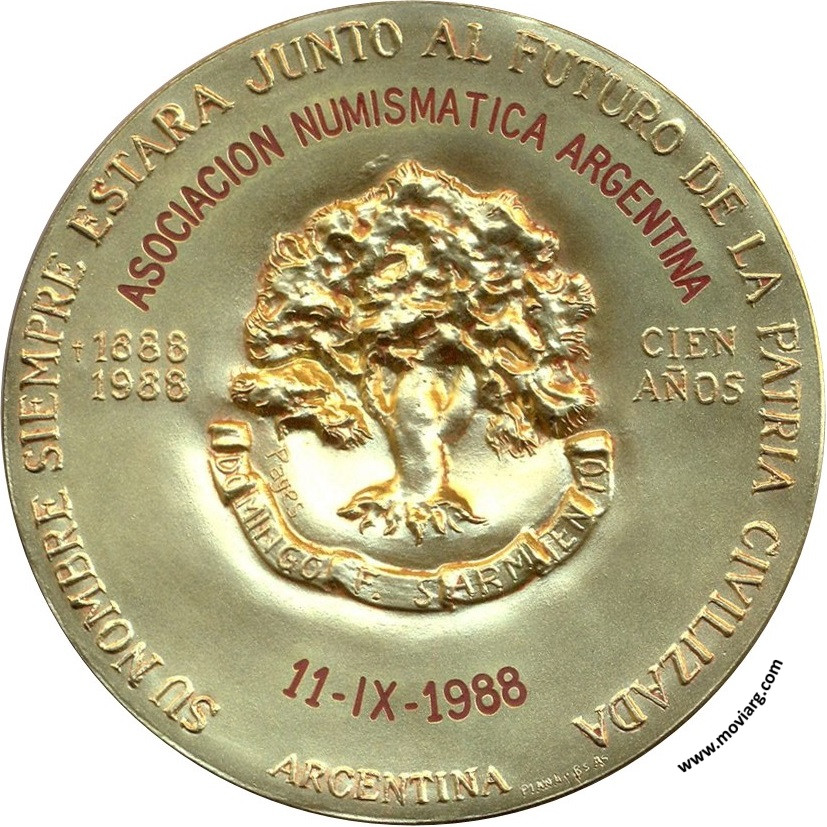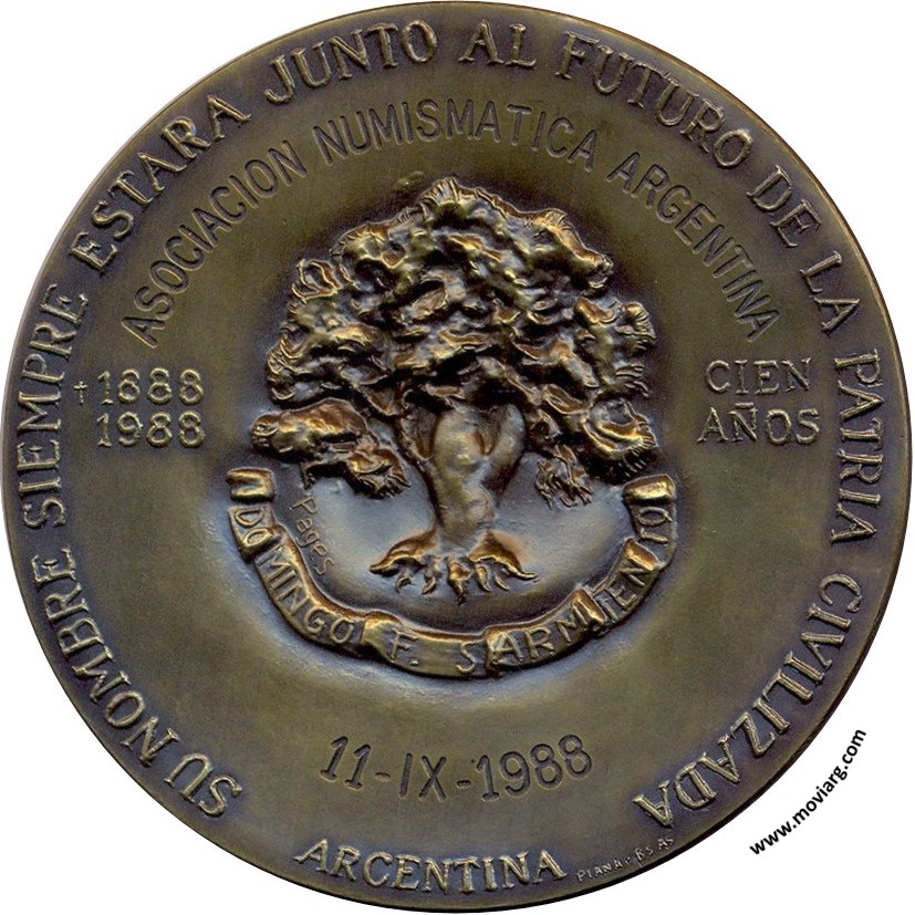 Anverso: Firma: PAGÉS / PIANA BS. AS. Reverso: SU NOMBRE SIEMPRE ESTARA JUNTO AL FUTURO DE LA PATRIA CIVILIZADA / ARGENTINA / 1888 / 1988 / CIEN / AÑOS / [ ASOCIACION NUMISMATICA ARGENTINA ] / [ 11 - IX - 1988 ]. Firma: PIANA BS. AS. / PAGES. Campo: DOMINGO F. SARMIENTO Referencia: | |