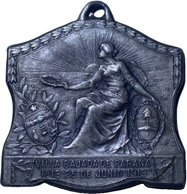 Colección Magnin Anverso: VILLA BAJADA DE PARANA / 1813 · 25 DE JUNIO · 1913Reverso: " PARANÁ / DECLARADA VILLA / POR LA / ASAMBLEA NACIONAL / CONSTITUYENTE / PRIMER CENTENARIO " Referencia: | |