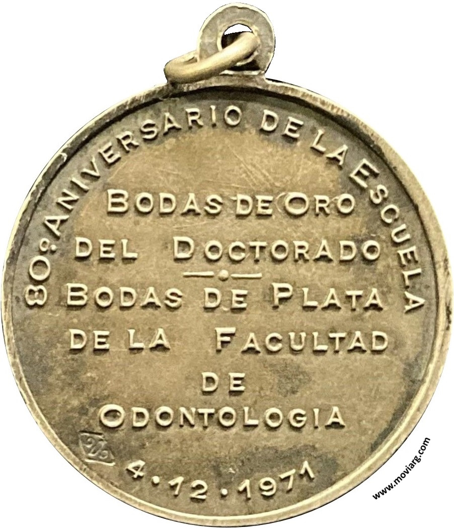 Anverso: UNIVERSIDAD DE BUENOS AIRES / FACULTAD DE ODONTOLOGIA Reverso: 80° ANIVERSARIO DE LA ESCUELA / BODAS DE ORO / DEL DOCTORADO / BODAS DE PLATA / DE LA FACULTAD / DE / ODONTOLOGIA / 4 · 12 · 1971. Exergo: [ <900> ] Referencia: | |