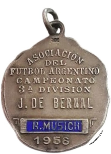 Anverso: Campo: AFA Reverso: ASOCIACION / DEL / FUTBOL ARGENTINO / CAMPEONATO / 3A. DIVISION / J. DE BERNAL / [ R. MUSICH ] / 1956. Exergo: [ 900 ] Referencia: | |