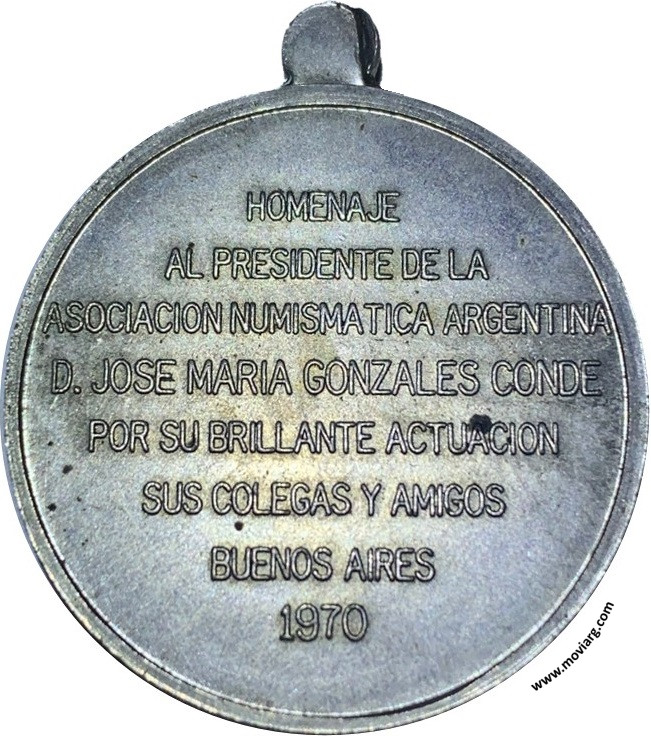 MAGNIN Anverso: TALENTUM / LABOR / É CONSTANTIAReverso: HOMENAJE / AL PRESIDENTE DE LA / ASOCIACION NUMISMATICA ARGENTINA / D. JOSE MARIA GONZALES CONDE / POR SU BRILLANTE ACTUACION / SUS COLEGAS Y AMIGOS / BUENOS AIRES / 1970 Referencia: | |