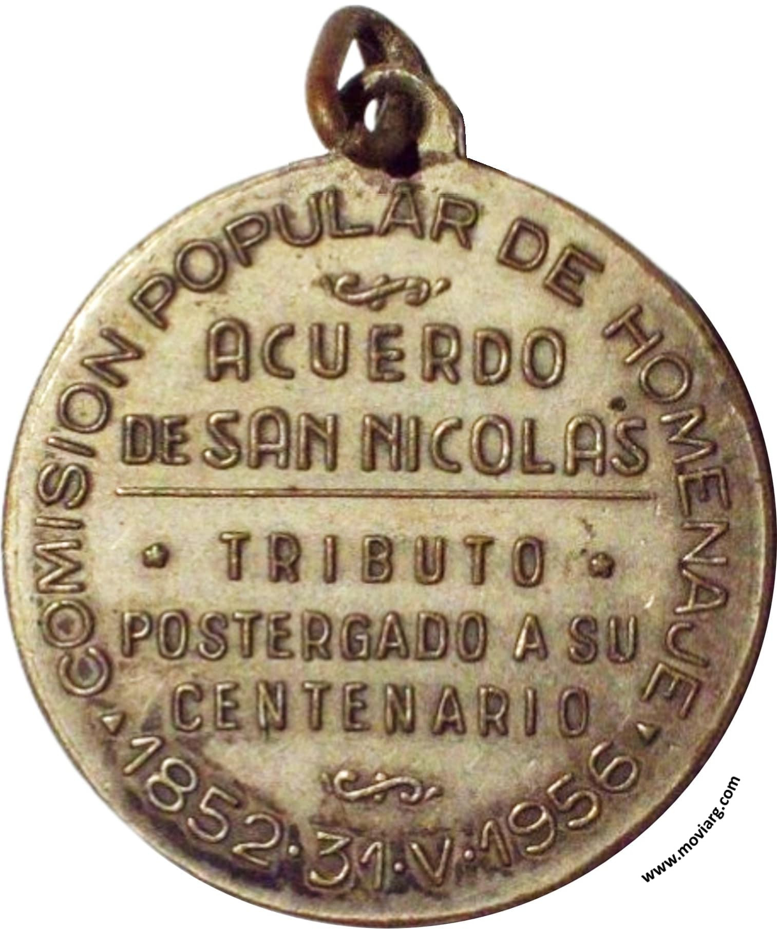 Anverso: Firma: O. GALLO Reverso: COMISION POPULAR DE HOMENAJE / ACUERDO / DE SAN NICOLÁS / TRIBUTO / POSTERGADO A SU / CENTENARIO / 1852 · 31 · V · 1956 Referencia: | |