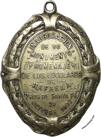 Anverso: MANUEL BELGRANO. Firma: BELLAGAMBA Y ROSSI Reverso: INAUGURACION / DE SU / MONUMENTO / HOMENAJE / DE LOS ESCOLARES / DE / RAFAELA / PROV. DE SANTA FÉ / 24 / OCTUBRE 1907 Referencia: | |
