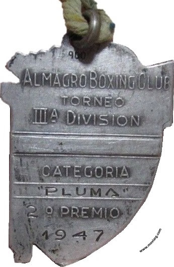 Anverso: Campo: ABC Reverso: ALMAGRO BOXING CLUB / TORNEO / IIIA. DIVISION / CATEGORIA / [ " PLUMA " ] / [ 2 ] ° PREMIO / [ 1947 ]. Exergo: [ 900 ] Canto: Liso Referencia: | |