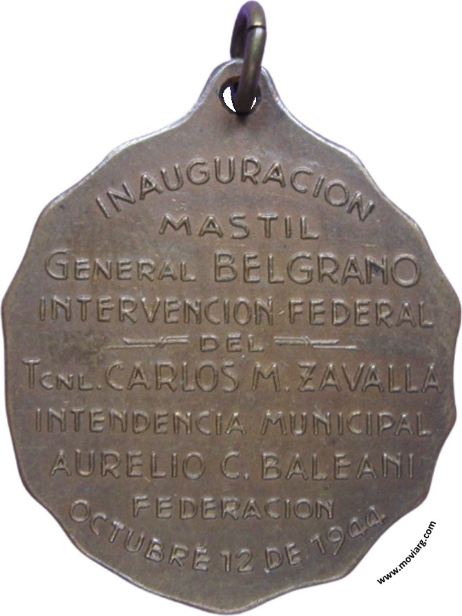Anverso: MANUEL BELGRANO / 1770 / 1820 Reverso: INAUGURACION / MASTIL / GENERAL BELGRANO / INTERVENCION FEDERAL / DEL / TCNL. CARLOS M. ZAVALLA / INTENDENCIA MUNICIPAL / AURELIO C. BALEANI / FEDERACION / OCTUBRE 12 DE 1944 Referencia: | |