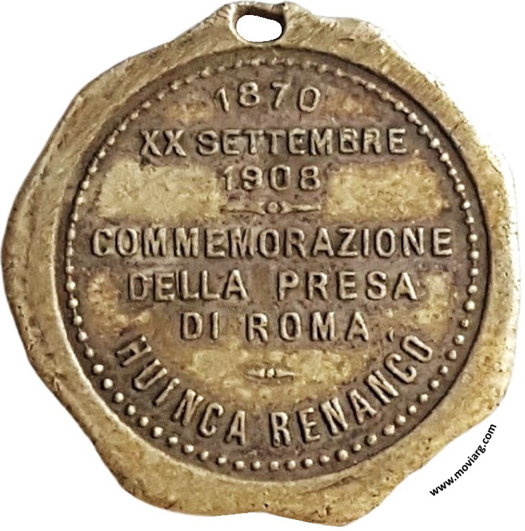 Anverso: Campo: S.P.Q.R. Reverso: 1870 / XX SETTEMBRE / 1908 / COMMEMORAZIONE / DELLA PRESA / DI ROMA / HUINCA RENANCÓ Referencia: | |