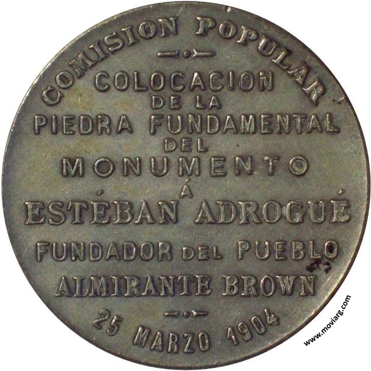 Anverso: Reverso: COMISION POPULAR / COLOCACION / DE LA / PIEDRA FUNDAMENTAL / DEL / MONUMENTO / Á / ESTÉBAN ADROGUÉ / FUNDADOR DEL PUEBLO / ALMIRANTE BROWN / 25 MARZO 1904 Referencia: | |