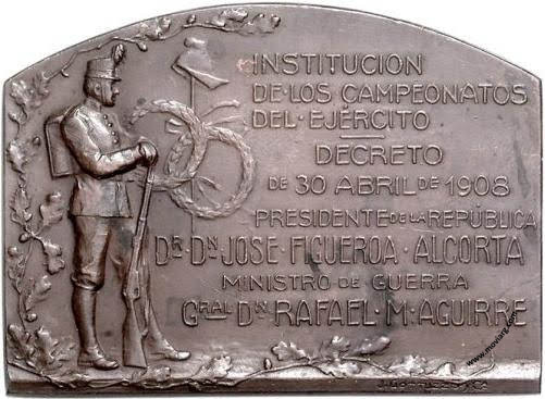 Anverso: Reverso: INSTITUCION / DE LOS CAMPEONATOS / DEL EJÉRCITO / DECRETO / DE 30 ABRIL DE 1908 / PRESIDENTE DE LA REPÚBLICA / DR. DN. JOSE FIGUEROA ALCORTA / MINISTRO DE GUERRA / GRAL. DN. RAFAEL M. AGUIRRE. Firma: J. GOTTUZZO Y CA. Referencia: | |