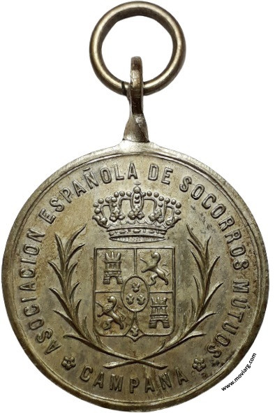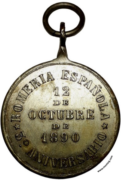 Anverso: ASOCIACION ESPAÑOLA DE SOCORROS MUTUOS / CAMPANA Reverso: ROMERIA ESPAÑOLA / 3° ANIVERSARIO / 12 / DE / OCTUBRE / DE / 1890 Referencia: | |