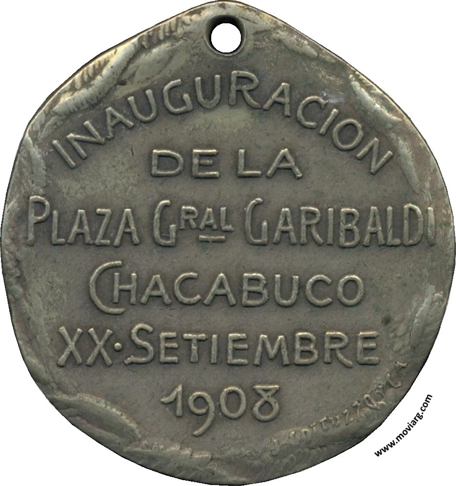 Anverso: GARIBALDI Reverso: INAUGURACION / DE LA / PLAZA GRAL. GARIBALDI / CHACABUCO / XX · SETIEMBRE / 1908. Firma: J. GOTTUZZO Y CA. Referencia: | |