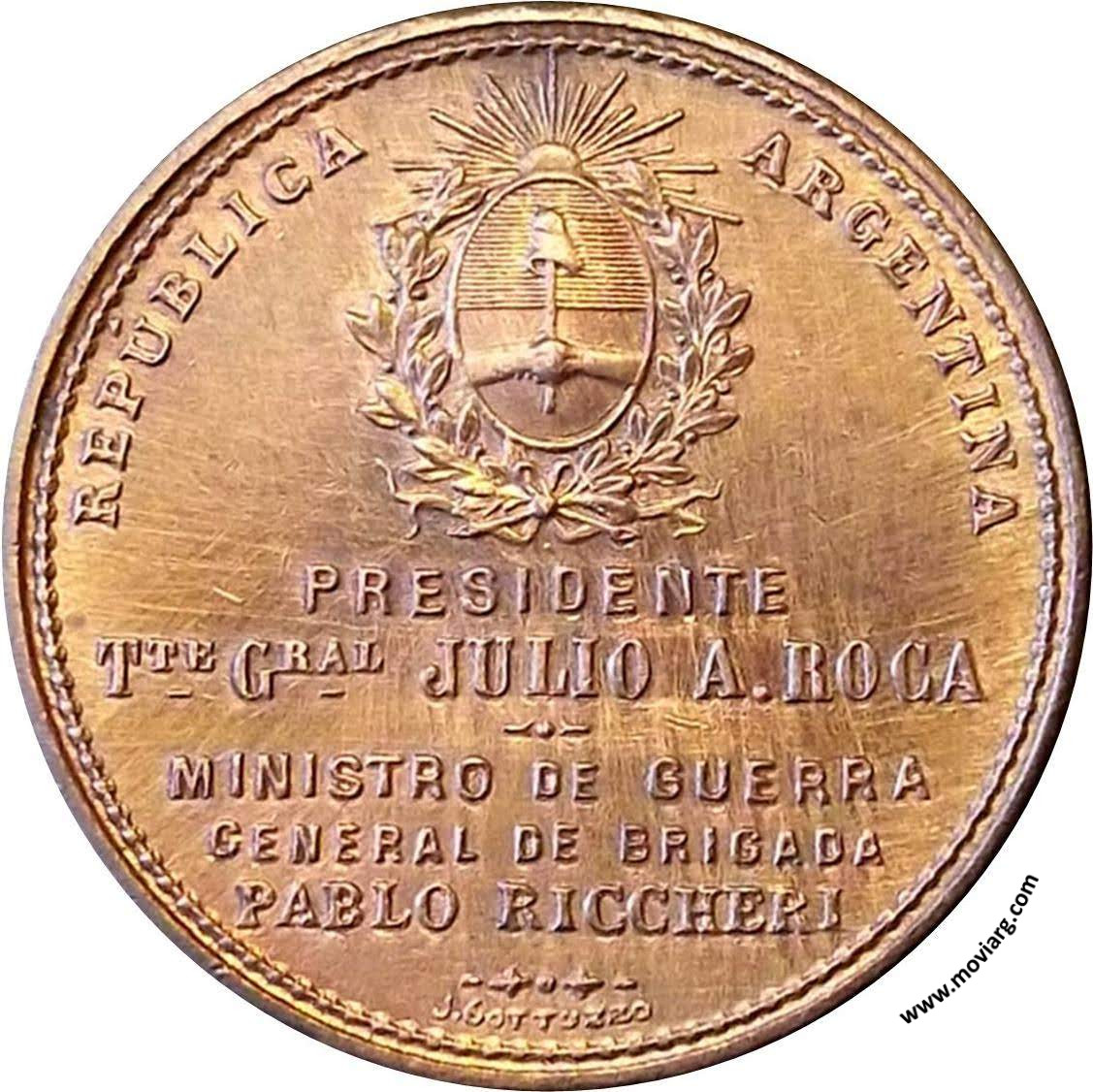 Anverso: ESCUELA MILITAR = COLOCACION DE LA PIEDRA FUNDAMENTAL / CASEROS 5 OCTUBRE 1904. Campo: LEY / 4290. Firma: A. DRESCO Reverso: REPÚBLICA ARGENTINA / PRESIDENTE / TTE. GRAL. JULIO A. ROCA / MINISTRO DE GUERRA / GENERAL DE BRIGADA / PABLO RICCHERI. Firma: J. GOTTUZZO Referencia: | |