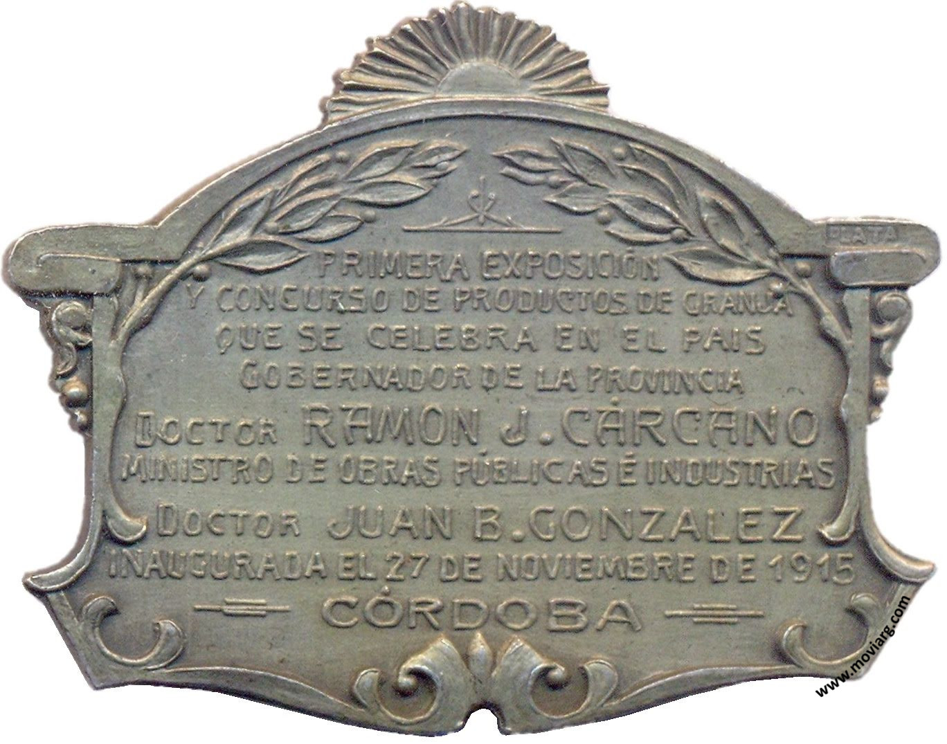 Anverso: Firma: HORTA Reverso: PRIMERA EXPOSICIÓN / Y CONCURSO DE PRODUCTOS DE GRANJA / QUE SE CELEBRA EN EL PAIS / GOBERNADOR DE LA PROVINCIA / DOCTOR RAMON J. CÁRCANO / MINISTRO DE OBRAS PÚBLICAS É INDUSTRIAS / DOCTOR JUAN B. GONZALEZ / INAUGURADA EL 27 DE NOVIEMBRE DE 1915 / CÓRDOBA. Exergo: [ PLATA ] Referencia: | |