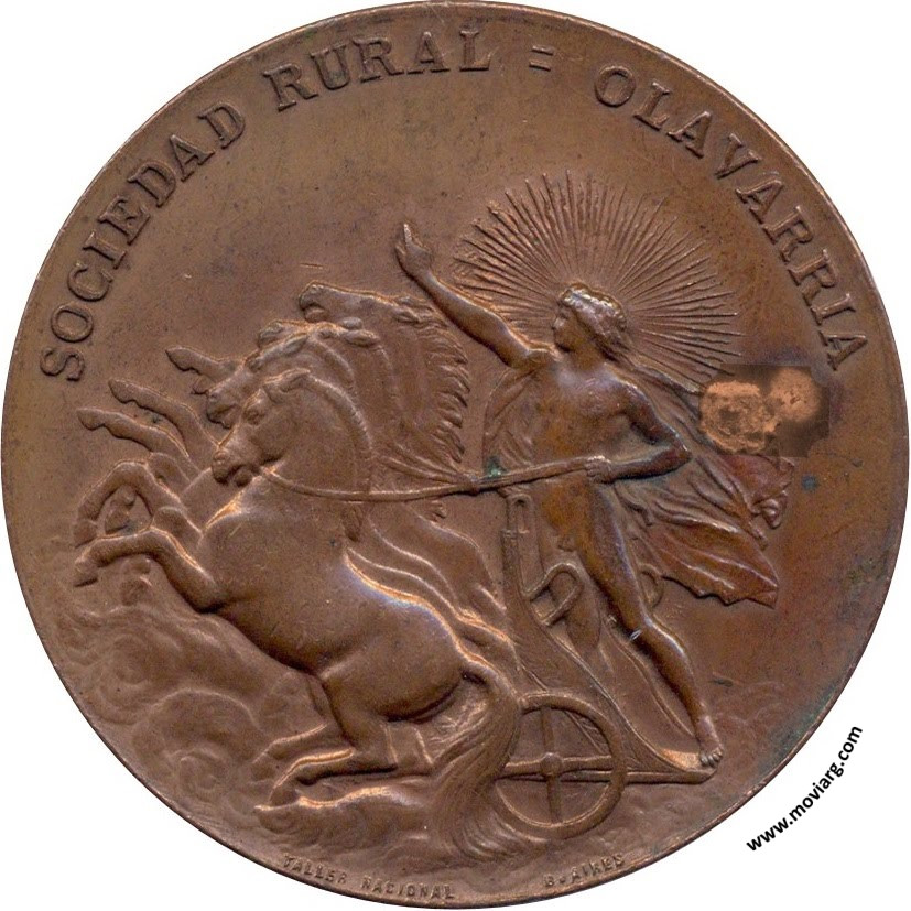 Anverso: SOCIEDAD RURAL = OLAVARRIA. Firma: TALLER NACIONAL / B. AIRES Reverso: XXVA. EXPOSICION FERIA / 4 , 5 Y 6 DE OCTUBRE 1908. Campo: LACLAU HERMANOS Canto: Liso. PLATA Referencia: | |