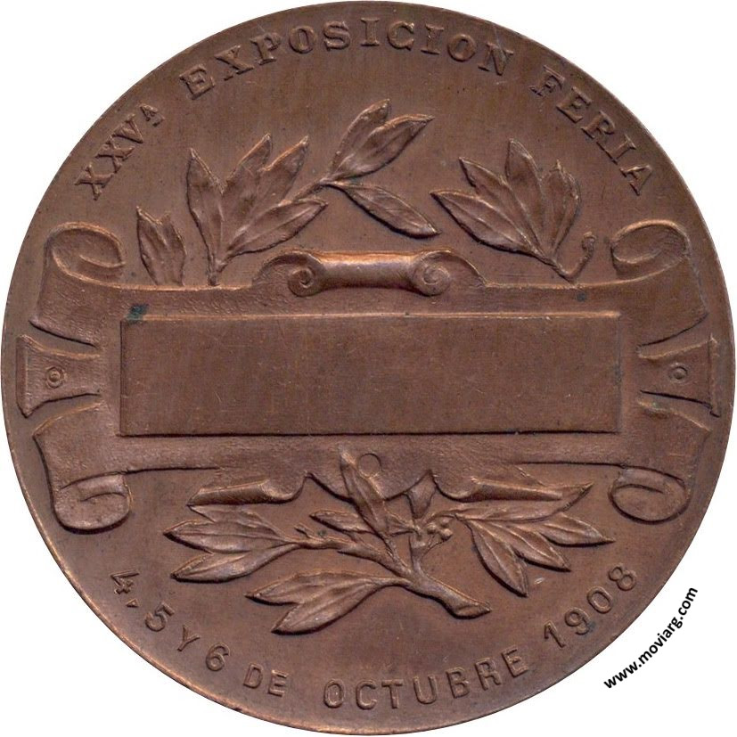| Año: 1908 Exposiciones Metal: Cobre - Peso: 52gr - Módulo: 51mm Grabador: Taller Nacional | |