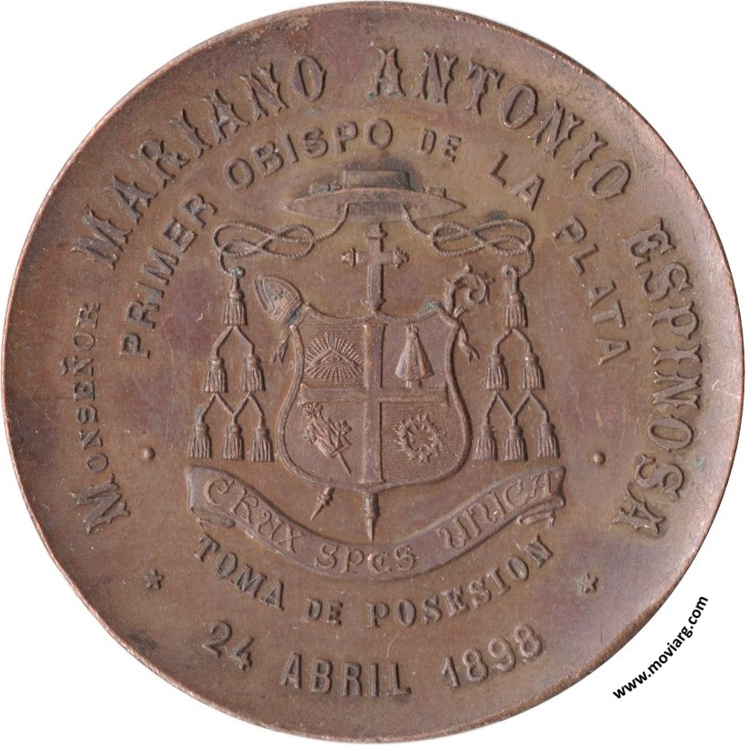 Colección MDS Anverso: Firma: ORZALI B. Y C.Reverso: MONSEÑOR MARIANO ANTONIO ESPINOSA / PRIMER OBISPO DE LA PLATA / TOMA DE POSESION / 24 ABRIL 1898. Campo: CRUX SPES UNICA Canto: Liso Referencia: | |