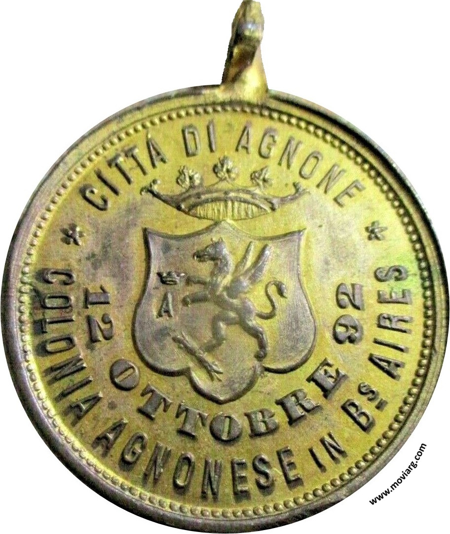 Anverso: CRISTOFORO COLOMBO / 4. CENTENARIO SCOPERTA D'AMERICA Reverso: CITTA DI AGNONE / 12 OTTOBRE 92 / COLONIA AGNONESE IN BS. AIRES Referencia: | |