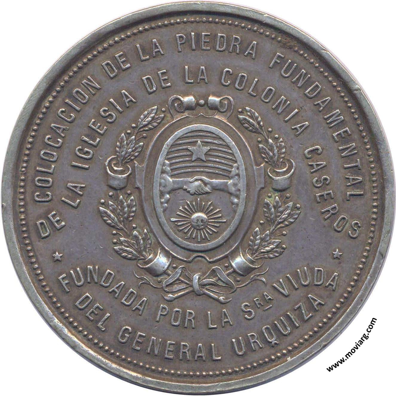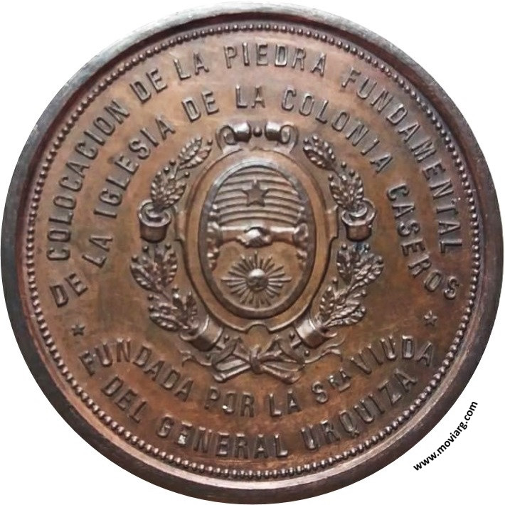 Anverso: COLOCACION DE LA PIEDRA FUNDAMENTAL / DE LA IGLESIA DE LA COLONIA CASEROS / FUNDADA POR LA SRA. VIUDA / DEL GENERAL URQUIZA Reverso: SIENDO PADRINO / EL DR. DN. / MIGUEL JUAREZ CELMAN / PRESIDENTE / DE LA / REPÚBLICA ARGENTINA / DICIEMBRE 1887 Referencia: | |