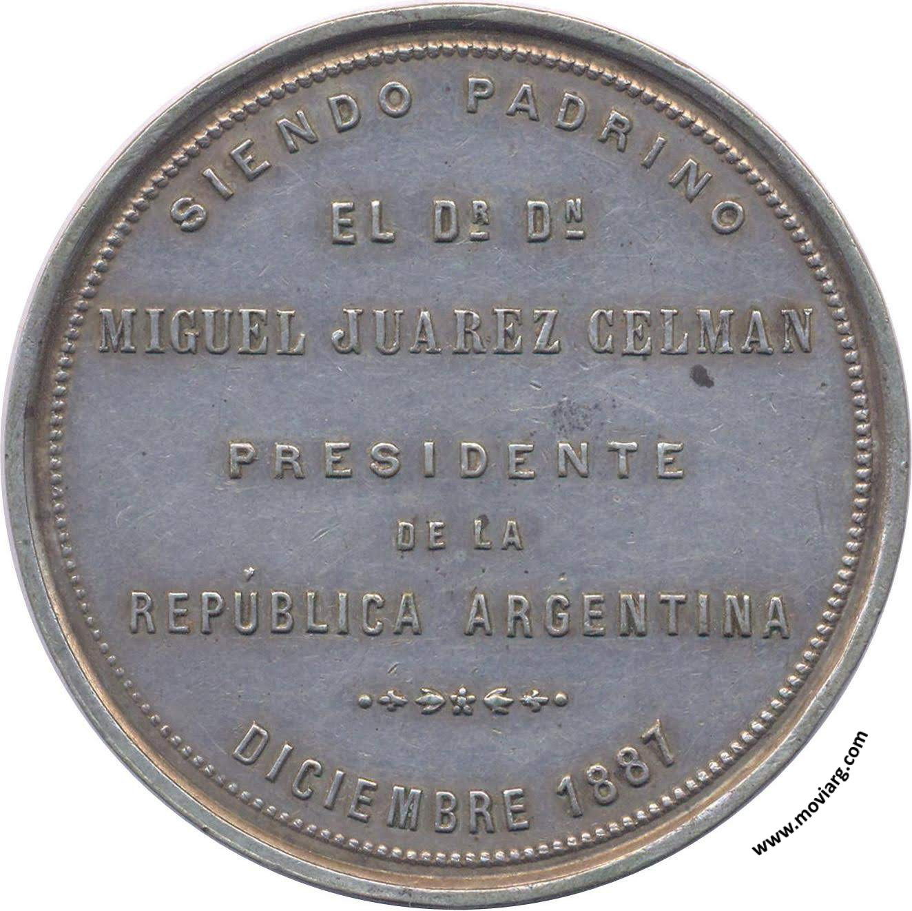 Anverso: COLOCACION DE LA PIEDRA FUNDAMENTAL / DE LA IGLESIA DE LA COLONIA CASEROS / FUNDADA POR LA SRA. VIUDA / DEL GENERAL URQUIZA Reverso: SIENDO PADRINO / EL DR. DN. / MIGUEL JUAREZ CELMAN / PRESIDENTE / DE LA / REPÚBLICA ARGENTINA / DICIEMBRE 1887 Canto: Liso Referencia: ROSA-331 | |