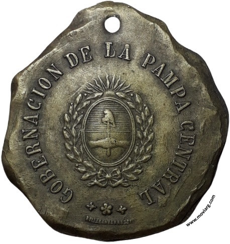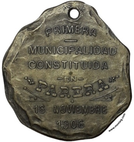 Anverso: GOBERNACION DE LA PAMPA CENTRAL. Firma: BELLAGAMBA Y ROSSI Reverso: PRIMERA / MUNICIPALIDAD / CONSTITUIDA / EN / PARERA / 16 NOVIEMBRE / 1906 Referencia: | |