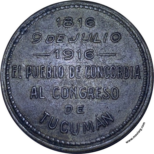 Colección Magnin Anverso: Firma: GOTTUZZO Y C.Reverso: 1816 / 9 DE JULIO / 1916 / EL PUEBLO DE CONCORDIA / AL CONGRESO / DE / TUCUMÁN Referencia: | |