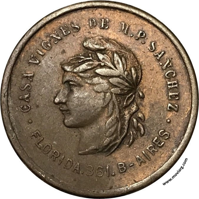 Anverso: CASA VIGNES DE M. P. SANCHEZ / FLORIDA. 361. B - AIRES Reverso: Canto: Nota Moviarg: En el Anuario Kraft de 1942 figura "Casa Vignes, de Modesto P. Sánchez, Florida 361", piezas como esta figuran en la base o adheridas de lado en varias estatuas y lámparas. La casa de remates Heritage vendió el 16 de Mayo de 2018 una lámpara de 1935 (aproximadamente) donde la misma posee esta pieza adherida de un costado de la base. Referencia: | |