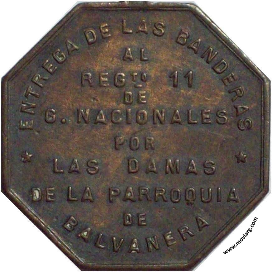 Anverso: 7 DE JULIO DE 1895 Reverso: ENTREGA DE LAS BANDERAS / AL REGTO. 11 / DE / G. NACIONALES / POR / LAS DAMAS / DE LA PARROQUIA / DE / BALVANERA Referencia: BURZIO-4229 | |