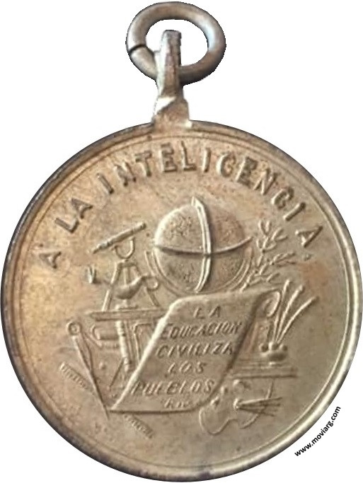 Anverso: A LA INTELIGENCIA. Campo: LA / EDUCACION / CIVILIZA / LOS / PUEBLOS / RIV. Reverso: COLEGIO PIO IX DE ARTES Y OFICIOS / ALMAGRO Referencia: | |