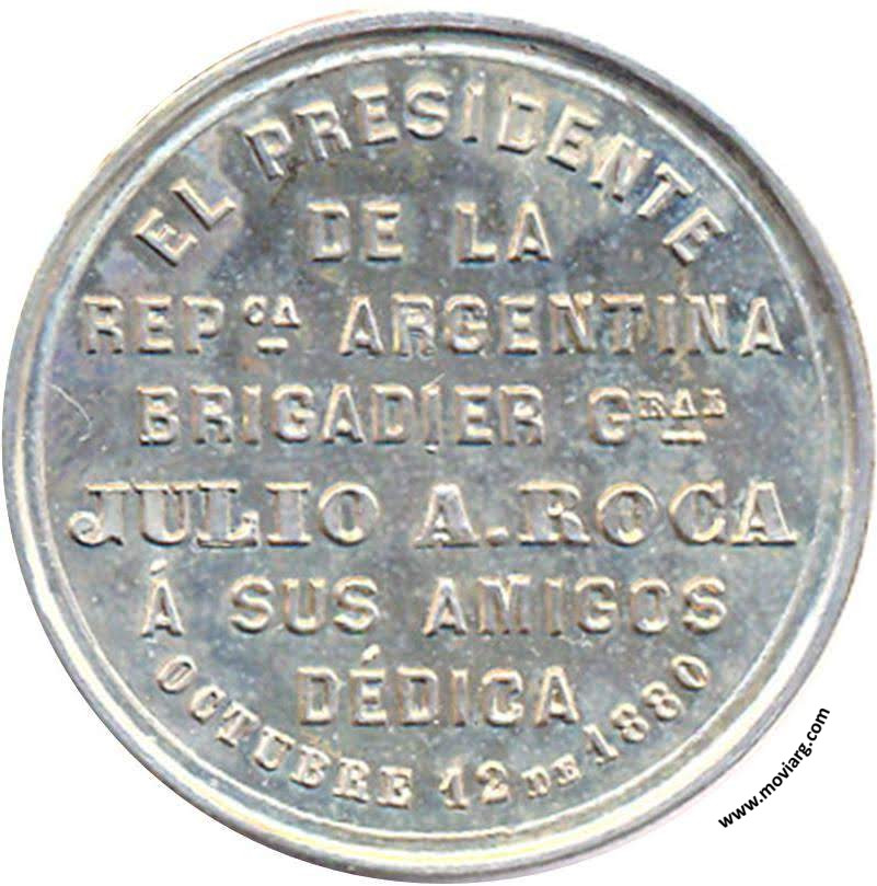 Anverso: UNION LIBERTAD Y PROGRESO. Firma: R. GRANDE Reverso: EL PRESIDENTE / DE LA / REPCA. ARGENTINA / BRIGADIER GRAL. / JULIO A. ROCA / Á SUS AMIGOS / DÉDICA / OCTUBRE 12 DE 1880 Canto: Humberto Burzio: "Buenos Aires en la medalla" 1981 p29. Referencia: BURZIO-25 FERRARI-54 (RG) | |