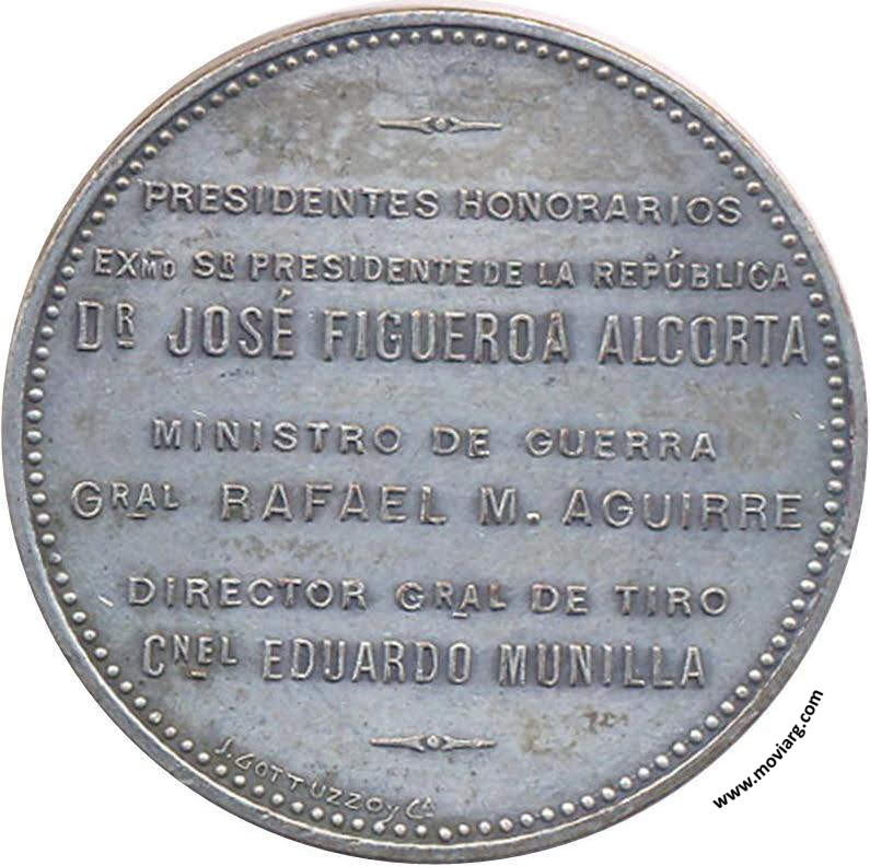 Anverso: TIRO FEDERAL JOSÉ DE SAN MARTIN / INAUGURADO EL 18 DE JUNIO 1909 Reverso: PRESIDENTES HONORARIOS / EXMO. SR. PRESIDENTE DE LA REPÚBLICA / DR. JOSÉ FIGUEROA ALCORTA / MINISTRO DE GUERRA / GRAL. RAFAEL M. AGUIRRE / DIRECTOR GRAL. DE TIRO / CNEL. EDUARDO MUNILLA. Firma: J. GOTTUZZO Y CA. Referencia: | |