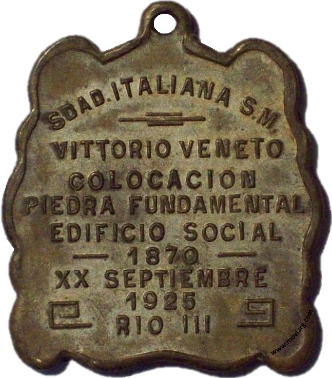 Anverso: Campo: S.P.Q.R. Reverso: SDAD. ITALIANA S.M. / VITTORIO VENETO / COLOCACION / PIEDRA FUNDAMENTAL / EDIFICIO SOCIAL / 1870 / XX SEPTIEMBRE / 1925 / RIO III Referencia: | |