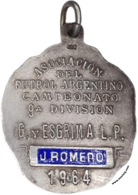 Anverso: Campo: AFA Reverso: ASOCIACION / DEL / FUTBOL ARGENTINO / CAMPEONATO / 9A. DIVISION / G. Y ESGRIMA L. P. / [ J. ROMERO ] / 1964. Exergo: [ 900 ] Referencia: | |