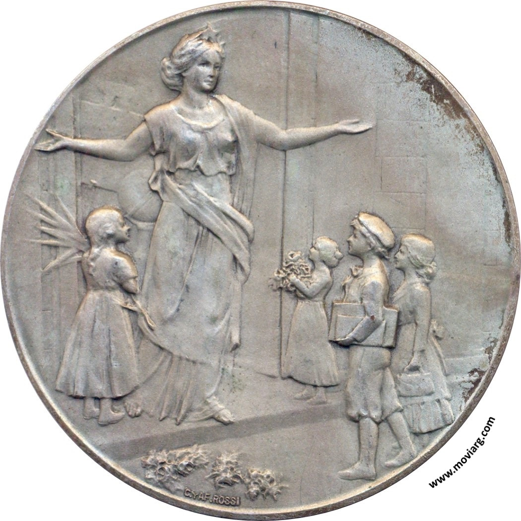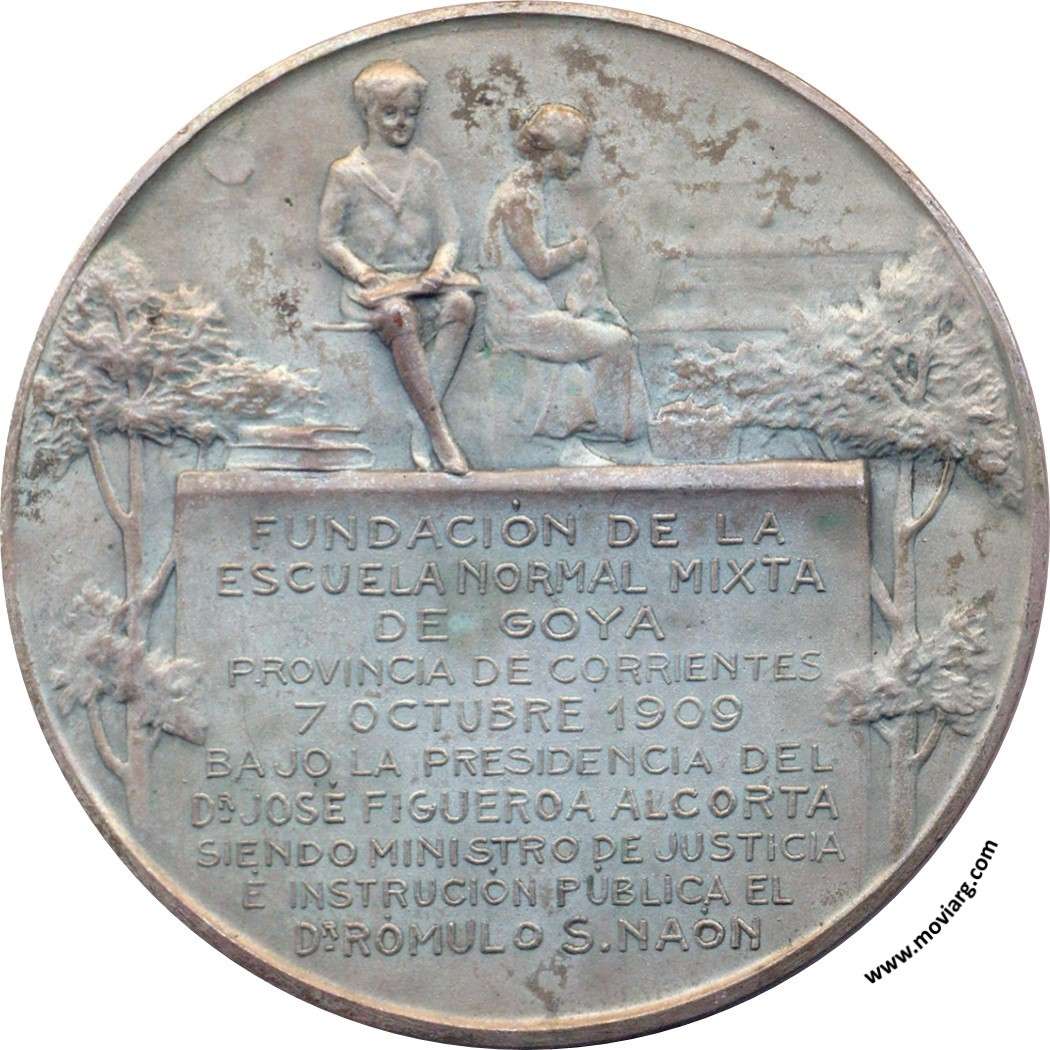 Anverso: Firma: C. Y AF. ROSSI Reverso: FUNDACIÓN DE LA / ESCUELA NORMAL MIXTA / DE GOYA / PROVINCIA DE CORRIENTES / 7 OCTUBRE 1909 / BAJO LA PRESIDENCIA DEL / DR. JOSÉ FIGUEROA ALCORTA / SIENDO MINISTRO DE JUSTICIA / É INSTRUCCIÓN PÚBLICA / DR. RÓMULO S. NAÓN Referencia: | |