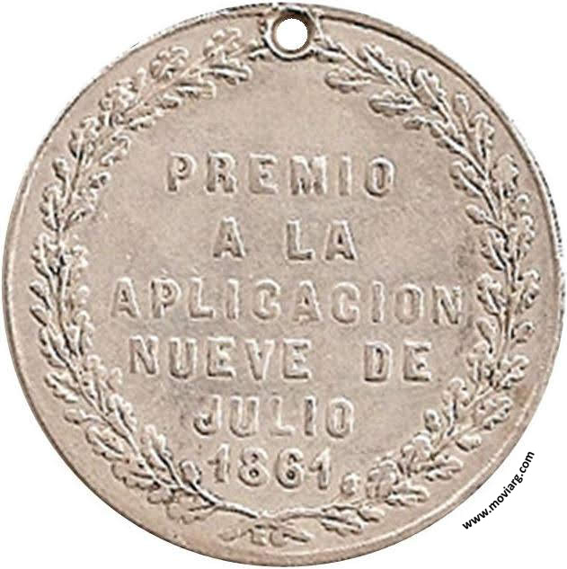 | Año: 1861 Premio al Mérito y Aplicación Metal: Plata - Peso: 7.83gr - Módulo: 31.64mm - Espesor: 1.2mm - Rotación: 12hrs Grabador: Rosario Grande | |
