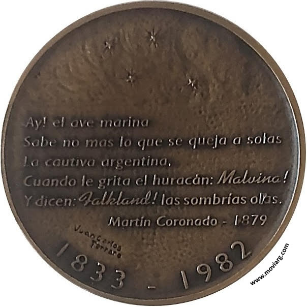Anverso: ¡ VIVEN Y VIVIRAN ! / MODESTO HOMENAJE / DE / VALENTIN ALBERTO ESPINOSA / A SUS COMPATRIOTAS / CAIDOS EN LA GESTA / DEL ATLÁNTICO SUR / 1996 / EN LAS GRANDES EMPRESAS, EL SOLO ACOMETERLAS HONRA Reverso: AY! EL AVE MARINA / SABE NO MAS LO QUE SE QUEJA A SOLAS / LA CAUTIVA ARGENTINA / CUANDO LE GRITA EL HURACÁN: MALVINA ! / Y DICEN: FALKLAND! LAS SOMBRÍAS OLAS. / MARTÍN CORONADO - 1879 / 1833 - 1982. Firma: JUAN CARLOS / FERRARO Referencia: | |