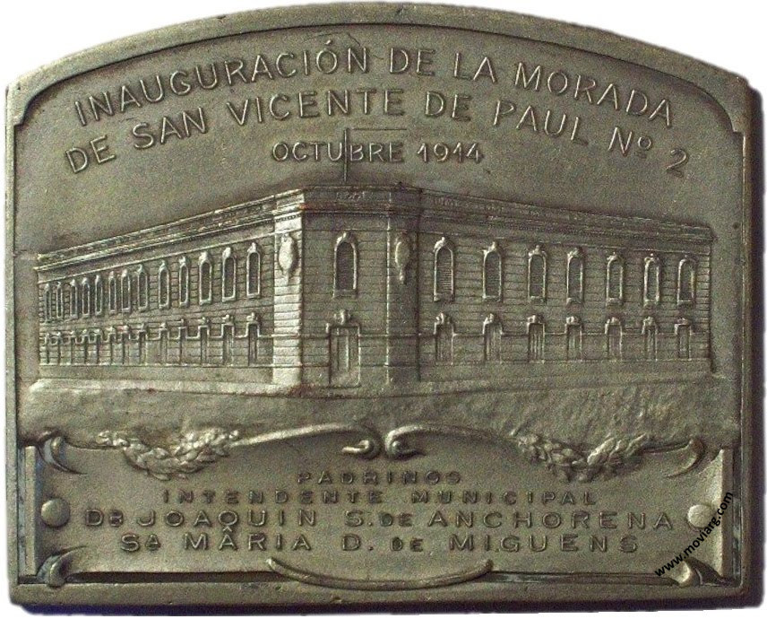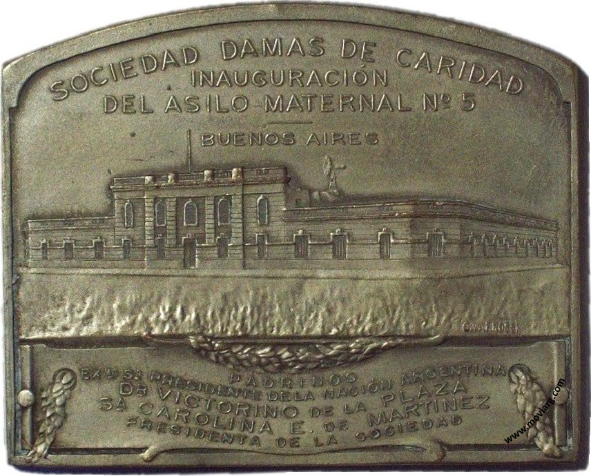 Anverso: INAUGURACIÓN DE LA MORADA / DE SAN VICENTE DE PAUL N°2 / OCTUBRE 1914 / PADRINOS / INTENDENTE MUNICIPAL / DR. JOAQUIN S. DE ANCHORENA / SA. MARIA D. DE MIGUENS Reverso: SOCIEDAD DAMAS DE CARIDAD / INAUGURACIÓN / DEL ASILO MATERNAL N°5 / BUENOS AIRES / PADRINOS / EXMO. SR. PRESIDENTE DE LA NACIÓN ARGENTINA / DR. VICTORINO DE LA PLAZA / SA. CAROLINA E. DE MARTINEZ / PRESIDENTE DE LA SOCIEDAD. Firma: C. Y AF. ROSSI Canto: Humberto Burzio: "Buenos Aires en la medalla" 1981 p1021. Referencia: BURZIO-3231 | |