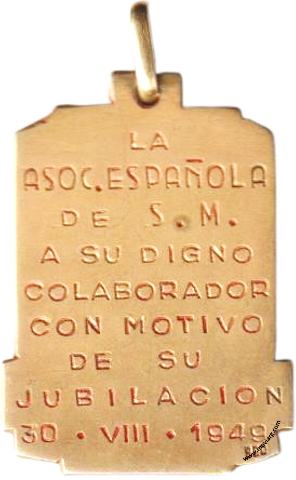 Anverso: [ CARMEN SANTIAGO ]. Firma: O. GALLO Reverso: [ LA ] / [ ASOC. ESPAÑOLA ] / [ DE S.M. ] / [ A SU DIGNO ] / [ COLABORADOR ] / [ CON MOTIVO ] / [ DE SU ] / [ JUBILACION ] / [ 30 · VIII · 1949 ]. Exergo: [ 900 ] Referencia: | |