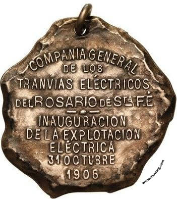 Anverso: Reverso: COMPANIA GENERAL / DE LOS / TRANVIAS ELÉCTRICOS / DEL ROSARIO DE STA. FÉ / INAUGURACION / DE LA EXPLOTACION / ELÉCTRICA / 31 OCTUBRE / 1906 Referencia: | |