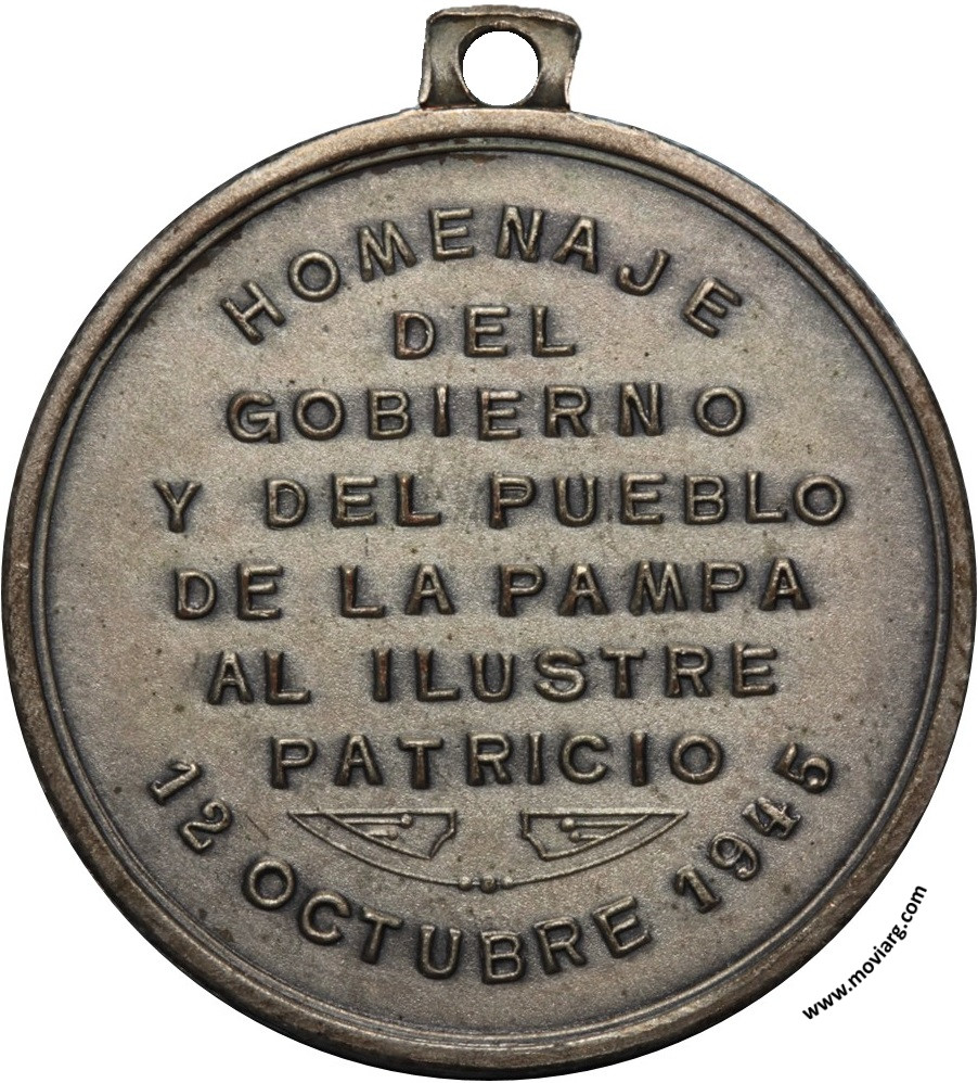 Colección @parryyanumismatico Anverso:Reverso: HOMENAJE / DEL / GOBIERNO / Y DEL PUEBLO / DE LA PAMPA / AL ILUSTRE / PATRICIO / 12 OCTUBRE 1945 Referencia: | |