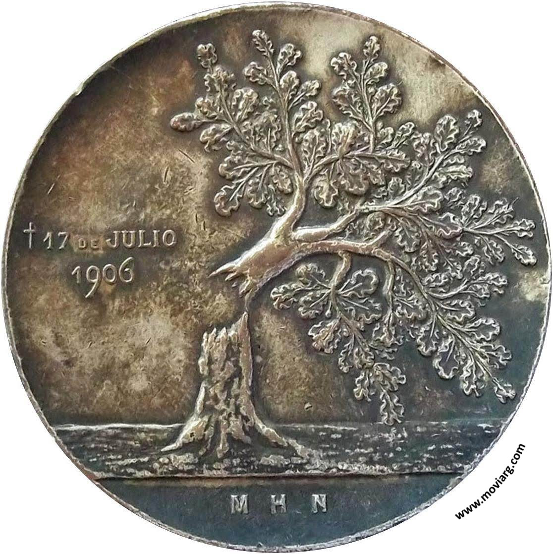 Anverso: CARLOS PELLEGRINI. Firma: A. BIDOGLIA / GRABÓ Reverso: † 17 DE JULIO / 1906 / M H N Referencia: BURZIO-1660 | |