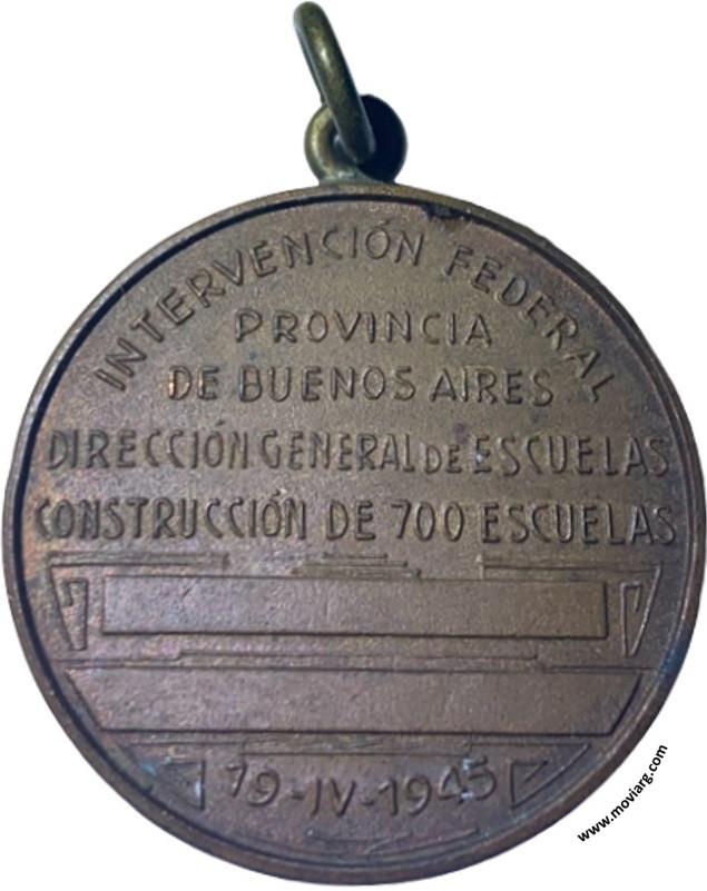 Colección Magnin Anverso:Reverso: INTERVENCIÓN FEDERAL / PROVINCIA / DE BUENOS AIRES / DIRECCIÓN GENERAL DE ESCUELAS / CONSTRUCCIÓN DE 700 ESCUELAS / 19 - IV - 1945 Referencia: | |