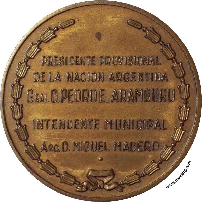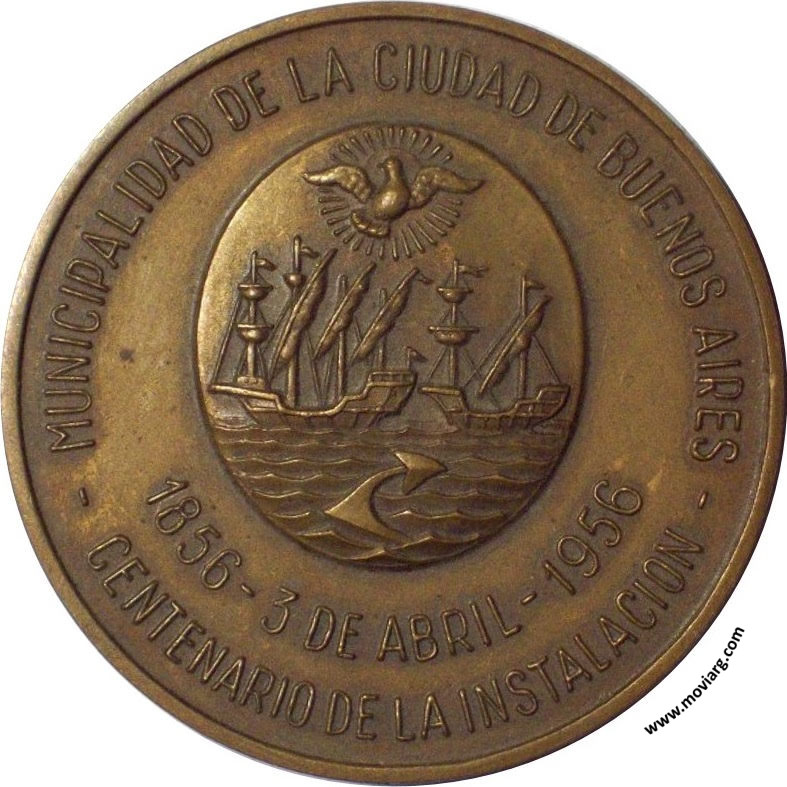 Anverso: MUNICIPALIDAD DE LA CIUDAD DE BUENOS AIRES / CENTENARIO DE LA INSTALACION / 1856 - 3 DE ABRIL - 1956 Reverso: PRESIDENTE PROVISIONAL / DE LA NACION ARGENTINA / GRAL. D. PEDRO E. ARAMBURU / INTENDENTE MUNICIPAL / ARQ. D. MIGUEL MADERO Referencia: | |